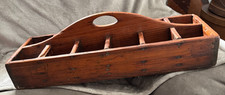 This product is a primitive wooden handled 12 compartment box, which is a unique and original piece. It is made of wood and has an unsigned design, giving it a rustic and authentic appeal. Perfect for storing small items or as a decorative piece, this box adds a touch of simplicity and charm to any space. 24 3/4 x 9 x 6 3/4