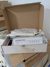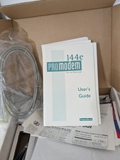 The modem is partially wrapped in protective plastic and includes its original cabling. The modem has not been powered on or tested. - Original user’s guide.