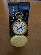 Puritan pocket watch still in original packaging and still zip tied to packaging. Will need new batter, not working now. Not sure how old, but unused.