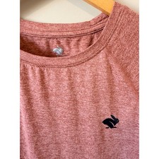 Rabbit EZ Tee short sleeve running shirt in a heathered clay pink or canyon sunset hue. This performance top is crafted from the brand's signature buttery-soft EZ fabric, offering a lightweight and breathable feel ideal for long runs or gym sessions. It features a classic crew neck, raglan sleeves for enhanced mobility, and the iconic rabbit logo on the left chest and back neck. Measurements: • Pit to Pit: 17.5" (35" doubled) • Length: 24"