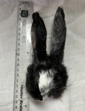 Unique face. Natural fur from rabbits, home tanned, humanely raised and harvested by me. Open eyes. Harlequin. The face is shaped and stiff. Ears are shaped upright. You receive the face pictured. I can combine shipping. leave a note with your items when ordering, so I can do that. I raise rabbits. I tan all my own furs using the age old alum method. This method is environmentally smart. I flesh, wash, shape and dry each face over a 21 day period. My best faces are the late fall and early winter ones. The rabbits are over 14 weeks old. I will have a few of these each year.