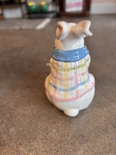 This 12.5" ceramic and porcelain bunny cookie jar is a rare find perfect for Spring and Easter. With a multicolor design featuring flowers, this whimsical jar is a charming addition to any kitchen or collectibles collection. The jar has one compartment and measures 13" in height, 8" in length, and 8" in width, making it a functional and decorative piece for storing your favorite cookies or candies.