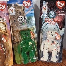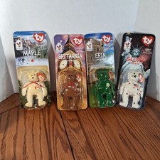 Extremely rear vintage McDonald's TY Beanie babies International Bear set they came out in 1999 in happy meals al 4 of these tags have mis print 1993 on them makes them worth more harder find they NIN the Maple Erin Britannia bears plastic has shaded color for some reason but the bears are great color never out box
