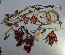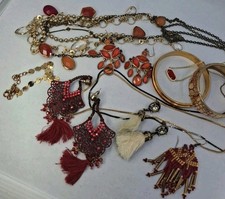 The Red & Gold Lot includes 15 pieces of mixed jewelry items such as earrings, necklaces, bracelets, and anklet. The pieces are made from a variety of materials including gemstones, enamel, plastic, metal, and rhinestones. The lot features a vibrant color scheme with a focus on gold, making it a versatile and eye-catching addition to any jewelry collection, offering a range of accessories to suit different styles and occasions!