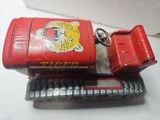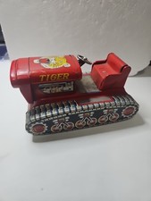 Beautiful graphics. Neat wind up toy tractor. The Red Wind Up Tiger Bulldozer Tractor is a vintage toy from the 1960s featuring a construction theme. This toy does not actually wind up, making it a unique collector's item for fans of electronic, battery-operated toys from the 1970s-1989 era. The Tiger brand adds a touch of nostalgia, and the bulldozer tractor driver character family makes it a fun and interactive playtime option for children aged 8 and up.