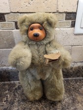 This vintage 1989 Robert Raikes Bears Cookie plush bear features a wooden face and original tag, making it a unique and collectible item for bear enthusiasts. With its brown color and 12'' size, this retired bear is a charming addition to any collection. Handcrafted with care and attention to detail, this 5-way jointed bear is signed by the artist and comes without packaging, adding to its authenticity and appeal. Perfect for all occasions, this bear from the Raikes Bears franchise is a timeless piece that captures the essence of animal-themed décor from the 1980s.