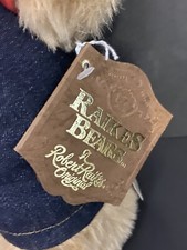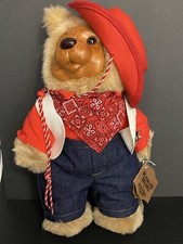 Robert Raikes Bears Jesse#17021 with box cow girl bear wooden face Western. All dressed up in western apparel The red bandanna , denim jeans, hat, badge Red check shirt with white vest. Red white blue American bear. Has paperwork & certificate of authenticity 4195/10000 Saturday matinee collection Original box & paperwork 12” bear I also have Bonnie if you wanted the pair