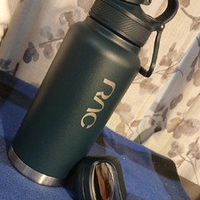 Rtic water bottle in dark green. Features a secure lid and handle.