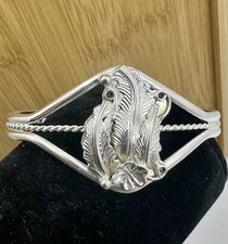 RUNNING BEAR RB Navajo Sterling Silver Etched Carve Feather Filigree Scroll Cuff