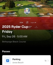 Friday parking pass for the Ryder Cup 2025 event at Bethpage Black. Access to park at Jones Beach State Park for visitors attending the 2025 Ryder Cup. Parking pass will be transferred same day as purchase.