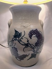 This is a working Salmon Falls Stoneware lamp, featuring a "Grapevine" pattern and original shade. This piece of hand-crafted, salt-glazed pottery features a raised, textured design of grape clusters and leaves in green and purple. It has the decorator's mark of Cindy Lucia Anderholm and is dated 2003.