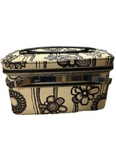 The Samsonite Vintage Luggage Train Case is a unique and stylish vanity case from the 1960s, featuring a classic black floral design. This true vintage piece is made with heavy-duty, hard-casing material and comes with the original keys for secure storage. Its retro design and durable construction make it a timeless and practical choice for travel or storage of valuable items.
