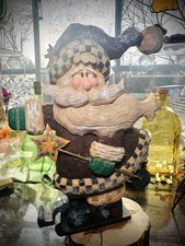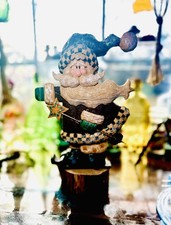 This large 11-inch resin figurine of Santa Claus is a rustic holiday decoration with a vintage folk art style. Made in the 1990s, it captures the charm of Christmas with its festive design and nostalgic theme. The unknown brand and artist add to the sense of whimsy and innocence that this piece exudes, making it a unique addition to any holiday decor collection.