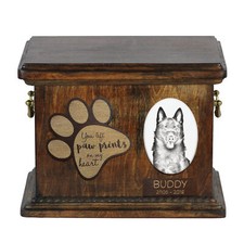 Schipperke If your four-legged friend has gone over the rainbow, you will certainly be looking for a suitable place to place his ashes. This personalized urn with a photo will be a fitting way to honor your beloved dog. We offer 200 different dog images in our collection, but you are free to immortalize your pet's photo on the urn. The submitted photo can be converted into a pencil sketch as shown in the photos in the listing, or we can also print it in color - the choice is yours. The urn is made of birch wood, has brass handles and decorations in the shape of a wreath. The removable lid allows for easy placement of ashes in the urn. It has no closure or seal, so the lid must be glued to permanently seal the urn. The photo is printed on a ceramic plate. This is a long lasting print that.