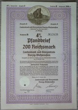Company: 4% Pfandbrief over 200 Reichsmarks the Landesbank and Girozentrale Danzig West Prussia Soup No.: Date: 25. January 1941 Face value: 200 RM Headquarters: Gdansk, Germany Size in cm approx.: 21 x 30 Devalued: yes Condition: 2, good, used, see photos Printing company: Giesecke & Devrient.
