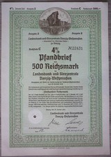 Company: 4% Pfandbrief over 100 Reichsmarks the Landesbank and Girozentrale Danzig West Prussia Soup No.: Date: 25. January 1941 Face value: 500 RM Headquarters: Gdansk, Germany Size in cm approx.: 21 x 30 Devalued: yes Condition: 2, good, used, see photos Printing company: Giesecke & Devrient.