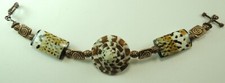 This is a shell bracelet with copper plated findings. The bracelet is about 8". The bracelet is about 1 1/16" wide. The bracelet has a toggle closure.