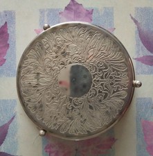 Shudehill Giftware 7 pieces silver plated wine coaster set with deeply engraved leaf design and green plastic base. The set consists of six coasters measuring 3.75 inches round and a coaster/bottle holder measuring 4.5 inches round. PLEASE NOTE - the silver plate is heavily tarnished and needs cleaning. I'm selling this item at a reduced priced, uncleaned, initially. If the item does not sell quickly, I will clean the silver myself and relist it at a higher price.