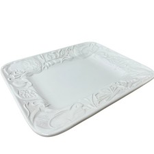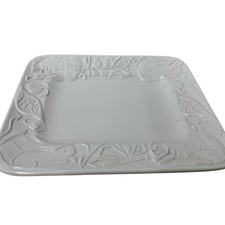 Beautiful glossy white square platter featuring an embossed border with stylized faces and scroll/floral motifs. Underside shows an embossed pitcher-and-glass icon and faint script that appears to include “Made in Italy” (mark is light—see photos).