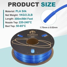 What is this?Premium Silk PLA Filament producing stunning high-shine prints with a smooth, metallic luster. Perfect for decorative models, artistic prints, toys, and cosplay props. This beginner-friendly filament is compatible with most 3D printers, including those with automatic color change systems.What will I get?Dimensional Accuracy: 1.75mm/0.07 inch, ± 0.02mmLength: 300mItem Weight: 1KG/2.2LBRecommended Nozzle/Extrusion Temp: 230-235°C (446- 455℉)Bed Temp: 50-60°CColor: BlueMaterial: PLA SilkPackage Contents: 1 PC x Silk PLA 3D Printer FilamentAre there any advantages of the product?Brilliant Silk Finish: Achieves a shiny, smooth surface with a luxurious metallic luster, making the decorative model stand out. Enhanced Toughness: Superior layer adhesion and impact resistance reduce brittleness compared to standard silk PLA.