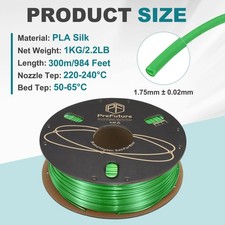What is this?Premium Silk PLA Filament producing stunning high-shine prints with a smooth, metallic luster. Perfect for decorative models, artistic prints, toys, and cosplay props. This beginner-friendly filament is compatible with most 3D printers, including those with automatic color change systems.What will I get?Dimensional Accuracy: 1.75mm/0.07 inch, ± 0.02mmLength: 300mItem Weight: 1KG/2.2LBRecommended Nozzle/Extrusion Temp: 230-235°C (446- 455℉)Bed Temp: 50-60°CColor: GreenMaterial: PLA SilkPackage Contents: 1 PC x Silk PLA 3D Printer FilamentAre there any advantages of the product?Brilliant Silk Finish: Achieves a shiny, smooth surface with a luxurious metallic luster, making the decorative model stand out. Enhanced Toughness: Superior layer adhesion and impact resistance reduce brittleness compared to standard silk PLA.