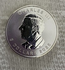 This is a 1 oz Canadian Silver Coin Charles lll on one side Maple Leaf one side 2025 $5 Coin It is not magnetic It passes JSP metal testing for silver On my inexpensive scale it weighs 1.04 oz It Pings nicely Based on the above I believe it to be Silver