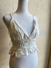 Sim & Sam White Ruffle Smocked Crop Top, Women's Size M. This bohemian-style top features thin spaghetti straps, a deep V-neckline, and an open back design. The smocked waist provides a comfortable, stretchy fit, finished with a feminine ruffle hem. Lightweight fabric makes it perfect for summer outings or beach days. Pre-owned condition with no visible holes or stains. Made in India.