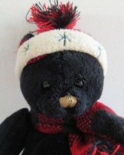 SMALL Plush BLACK TEDDY BEAR. with RED Plaid HAT & Scarf. ,,,great unusual NICELY PRICED finds,,.