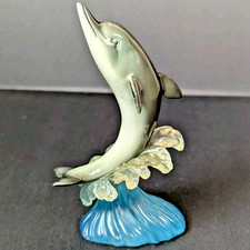 This small vintage plastic resin dolphin figurine features intricate details of a dolphin dancing on a translucent wave. Standing at 4 inches tall, this whimsical collectible is perfect for fans of marine life and dolphins. Made from durable resin, this figurine is a unique and charming addition to any animal figurine collection. Condition is Pre-owned. Please Refer to Pictures for Condition Details and Measurements.
