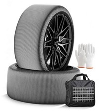 Includes a pair of snow socks for tires, a zippered storage bag and a pair of gloves. Ultimate grip, durable, tear-resistant, washable, and reusable. These tire snow socks easily fit any car or SUV, ideal for rentals or high-end vehicles.