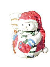 VERY CUTE VINTAGE SNOW MAN WITH BROOM COOKIE JAR. HAND PAINTED CERAMIC. SEE PICS.