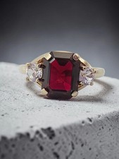 Solid 10K Yellow Gold Ring with Emerald-Cut Ruby & White Topaz Accents – Size 7