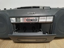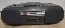 The Sony CFD-909 is a black boombox with a CD player, AM/FM radio, and cassette tape playback capabilities. It has an amplifier and 20W RMS power, as well as a headphone jack for private listening. This portable stereo unit also features and tape recorder, making it a versatile and powerful option for music lovers on the go. Its compact design and brand quality make it a great choice for anyone looking for a reliable and high-quality portable audio device. Unit doesn't output any audio through speakers or headphones. The volume knob is broken, probably why there's no sound. Also, the lens for the CD laser was lost at some point. The cassette player is spinning, belt is in OK shape. Chassis has no marks or scratches or dents. What you see is what you get.