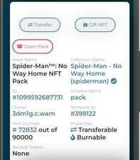 Spiderman No Way Home NFT promotional giveaway from AMC. First time ever drop from this theater don't miss out! Buy now at a smoking hot price that will be sure to return the favor! NFT pack is #77832 and is unopened. Ready to transfer to your own Wax wallet! This auction is for the NFT ONLY! The ticket to watch No Way Home is not included!