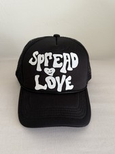 Black trucker hat featuring a bold “Spread Love” graphic on the front panel. Classic trucker style with structured front, breathable mesh back panels, and adjustable snapback closure. Lightweight and comfortable design suitable for everyday wear. The hat is in excellent pre-owned condition with minimal signs of use. Please review photos carefully as they are part of the description. C08-025
