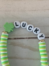 This bracelet has a green shamrock fimo clay bead. It has lucky letter beads. It has two gold hieshi beads. It has white, yellow, and green hieshi beads. It is made with .8mm sturdy stretch string. I tie it several times to prevent breakage. It is 6 inches around. It stretches to fit on the wrist.