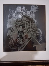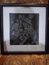 The product is a framed glass etching collage featuring the iconic imagery of Stanley Kubrick. Measuring 19x22 inches, this artwork captures the distinctive style and themes of the renowned filmmaker's work, making it a unique and visually striking piece for any fan or collector of Kubrick's oeuvre. The intricate etchings on glass give the creation a high-quality and sophisticated aesthetic, adding value to any space it is displayed in.