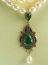 Statement 2 Strand Pearl Necklace Simulated Emerald Rubies Handcrafted Wedding