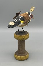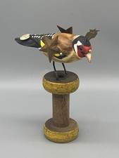 6”x5”x3” “Marion” Handmade! This sculpture features a solid wood , hand carved and hand painted bird, mounted on antique spool and he is adorned with vintage found objects. Inspired by the works of the Mullanium birds which are sadly no longer available.