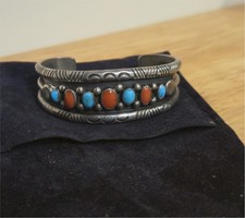 Sterling Silver Native American Coral - Turquoise Cuff Bracelet marked Thompson