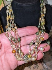 Stones & Seed Beads 5 Strand Necklace - Tans, Green, Cream, Gold, Silver