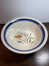 This vintage stoneware 9" serving bowl is a sturdy and stylish piece for serving at all occasions. The round shape, glossy finish, and art pottery production style give it a unique and retro charm. The unmarked brand adds a sense of mystery to the piece, which is perfect for enthusiasts of pottery and glass collectibles.