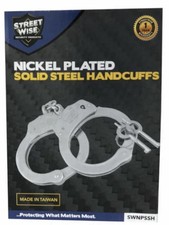 The Street Wise Nickel Plated Solid Steel Handcuffs with Keys (SWNPSSH) are a durable and reliable means of personal security. These handcuffs are crafted from high-quality solid steel and nickel plated for corrosion resistance. The brand, Street Wise, ensures a trusted and dependable product. The handcuffs come with keys for easy unlocking, making them a practical choice for personal safety and security.