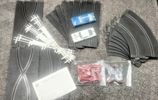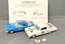 1966 Strombecker Plymouth Barracuda Slot Car Racing Set (Missing Original Box). 8 - 14" Strombecker Guard Rails. White 1966 Plymouth Barracuda, Aluminum Base - Working. Blue 1966 Plymouth Barracuda, Aluminum Base - Not Working.