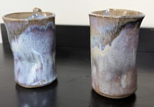 Pre-owned mugs are in excellent condition. They are mis-shaped and quirky in all the right ways! Both are artist signed. Width, Handle to Edge of Rim - 5". These would make an excellent house-warming gift!