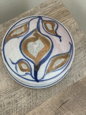 Studio Pottery Trinket Round Box Lid Beige Orange Blue Leaves Signed