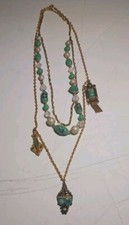 This stunning 16" necklace is handmade in the United States and features vintage style brass and wedding cake beads. It is designed in an assemblage style, creating a unique and beautiful piece of jewelry with an Art Deco theme. Perfect for collectors or those looking for a unique look. The drop is 24" . It features peaking glass pendants. Please feel free to make an offer.