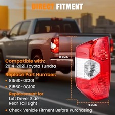 Tail Lights Compatible with Toyota Tundra 2014-2021 Pickup Left Rear Taillight Assembly Red Brake Signal Lamp with Bulbs, Replace # 81560-0C101 81560-0C100. 【Multi-Functional 3 Light Modes】Equipped with three lighting modes—brake lights, turn signals and reversing lights—this taillight assembly ensures comprehensive rear-end visibility.