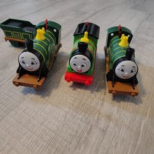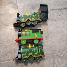 Thomas & Friends TrackMaster motorized toy train set includes two Emily engines with one tender and one Percy engine. These battery-operated trains feature the updated character designs from the All Engines Go series, showcasing vibrant green colors and cheerful facial expressions. Perfect for expanding any TrackMaster or wood-compatible railway layout, these durable plastic engines are designed for motorized action on standard tracks.
