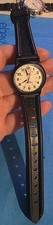 Timex wristwatch featuring a durable black resin strap and a clear white dial with black numerals. Water resistant design suitable for everyday wear. Comfortable and adjustable fit with multiple strap holes. Simple and classic style ideal for casual use.